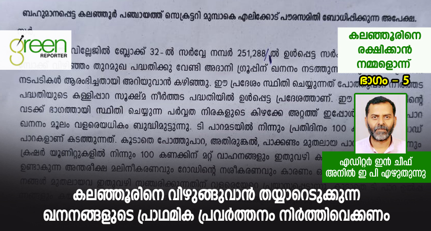 കലഞ്ഞൂരിനെ വിഴുങ്ങുവാൻ തയ്യാറെടുക്കുന്ന ഖനനങ്ങളുടെ പ്രാഥമിക പ്രവർത്തനം നിർത്തിവെക്കണം
