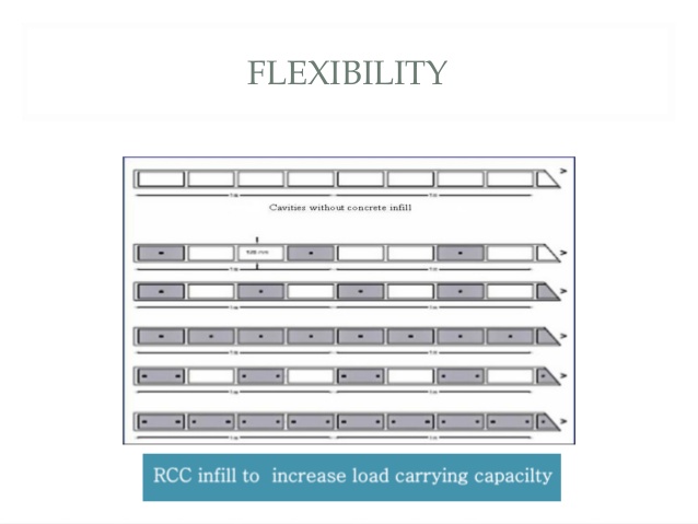 Rapidwall panel is world’s largest loadbearing lightweight panels. The panels are manufactured with size 12 m length, 3m height and 124 mm thickness. Each panel has 48 modular cavities of 230 mm x 94 mm x 3m dimension. The weight of one panel is 1440 kg or 40 kg/sqm. The density is 1.14g/cm3 , being only 10-12% of the weight of comparable concrete /brick masonry.