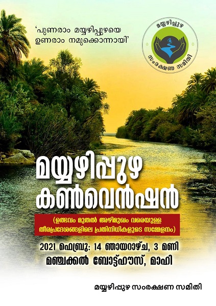 വയനാട് കുഞ്ഞോത്ത് നിന്നും ഉൽഭവിച്ച് മാഹി അഴിമുഖം വരെ 54 കിലോമീറ്റർ നീളമുള്ള മയ്യഴിപ്പുഴയെ ഒരു യൂണിറ്റായി കണ്ട്, "പുണരാം മയ്യഴിപ്പുഴയെ, ഉണരാം നമുക്കൊന്നായി" എന്ന സ്നേഹാഹ്വാനവുമായി, ജനകീയ പുഴ സംരക്ഷണ പ്രവർത്തനങ്ങൾക്ക് തുടക്കം കുറിക്കുന്നു. ഞായറാഴ്ച ഫെബ്രുവരി 14ന് വൈകിട്ട് 3 മണിക്ക്, മാഹി മഞ്ചക്കൽ ബോട്ട് ഹൗസ് പരിസരത്ത് വെച്ച് മയ്യഴിപ്പുഴ കൺവെൻഷൻ സംഘടിപ്പിക്കും.