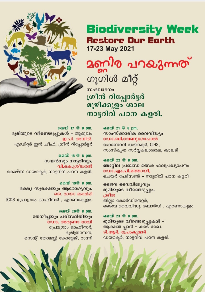 ഗ്രീൻ റിപ്പോർട്ടറിന്റെയും മൂഴിക്കുളം ശാലയുടെയും നേതൃത്വത്തിൽ നടന്ന് വരുന്ന 'മണ്ണിര പറയുന്നത്' ഗൂഗിൾ മീറ്റിന്റെ നാലാം ദിനമായ ഇന്ന് ഗൂഗിൾ മീറ്റ് വൈദ്യരത്നം ആയ്യൂർവേദ കോളേജ് NSS പ്രോഗ്രാം ഓഫീസർ ഡോ.രജിത ഉദ്ഘാടനം ചെയ്യും. തേനീച്ച ദിനം കൂടിയായ ഇന്ന് പ്രഭാഷണം നടക്കുന്നത് തേനീച്ചയും പരിസ്ഥിതിയും എന്ന വിഷയത്തിലാണ്. ഡോ. ആരുണാ ദേവി, ഭൂമിത്രസേന പ്രോഗ്രാം ഓഫീസർ , സെന്റ് തോമസ്സ് കോളേജ്, റാന്നി പ്രഭാഷണം നടത്തും.