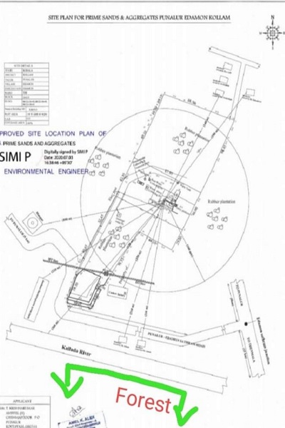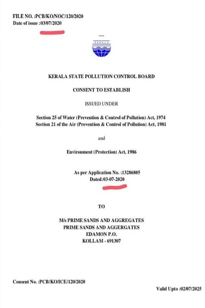 M/S പ്രൈം സാൻഡ്സ് ആൻഡ് അഗ്ഗ്രിഗേറ്റസ് എന്ന ഈ സ്ഥാപനത്തിന്റെ സൈറ്റ് പ്ലാനിൽ 260 മീറ്റർ ദൂരത്തു കല്ലടയാർ സ്ഥിതി ചെയ്യുന്നതായി കാണപ്പെടുന്നു. എന്നാൽ 220മീറ്ററിലാണ് കല്ലടയാർ സ്ഥിതി ചെയ്യുന്നത്. സ്ഥാപനത്തിന്റെ 240മീറ്റർ ദൂരത്ത് അഞ്ചൽ ഫോറെസ്റ്റ് റിസർവ് വനം സ്ഥിതി ചെയ്യുന്നു. എന്നാൽ കേരള മലിനീകരണ നിയന്ത്രണ ബോർഡ് ഈ സ്ഥാപനത്തിന് വേണ്ടി നൽകിയ കൺസെന്റിലെ സൈറ്റ് പ്ലാനിൽ വനം ഉള്ളതായി കാണിച്ചിട്ടില്ല. ഫോറെസ്റ്റ് ഡിപ്പാർട്മെന്റിന്റെ എൻഒസി ഇല്ലാതെയാണ് മലിനീകരണ നിയന്ത്രണ ബോർഡ് സ്ഥാപനത്തിന് കൺസെന്റ് നൽകിയിട്ടുള്ളത്.