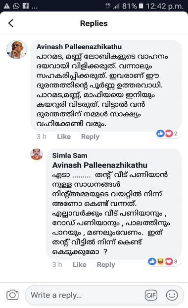 ആഗസ്റ്റ് 15 നായിരുന്നു സംഭവം. പ്രളയക്കെടുതിയിൽ ദുരിതം അനുഭവിക്കുന്നവർക്ക് അടിയന്തിര സഹായമെത്തിക്കാൻ അഞ്ച് ട്രക്കുകൾ ആവശ്യമുണ്ടെന്നുകാട്ടിയിട്ട പോസ്റ്റിൽ നിരവധി ടിപ്പർ ഡ്രൈവർമാരും വാഹന ഉടമകളും സഹായം വഗ്ദാനം ചെയ്തു. ഇതിൽ ചില പാറമട മുതലാളിമാരും ഉണ്ടായിരുന്നു. ഇത് കണ്ട പലരും പാറമട മുതലാളിമാരുടെ വണ്ടി തിരഞ്ഞെടുക്കരുതെന്ന് കമന്റ് ചെയ്തു. ഇതിൽ പ്രകോപിതനായ പത്തനംതിട്ട സിംല ട്രാൻസ്പോർട്ടിംഗ് ഉടമയായ സിംലസാം പ്രവാസിയായ മോൻസി ചെറിയാൻ തുണ്ടിയിൽ, സ്വാതി സന്തോഷ്, ജോജൻ വർഗീസ്, പരിസ്ഥിതി പ്രവർത്തകനായ അവിനാഷ് പള്ളീനഴികത്ത് എന്നിവർക്കെതിരെ സഭ്യമല്ലാത്ത രീതിയിൽ പ്രതികരിച്ചത്.