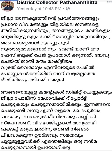 കളക്ടറുടെ ഫേസ്ബുക്ക് പേജിൽ അശ്ലീല പരാമർശം; നടപടിയെടുക്കാതെ ജില്ലാ ഭരണകൂടം