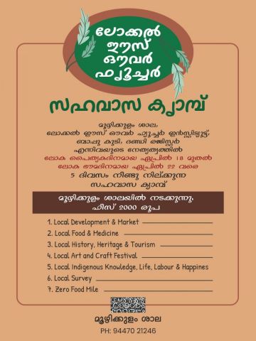 മൂഴിക്കുളം ശാല,ലോക്കൽ ഈസ് ഔവർ ഫ്യൂച്ചർ ഇൻസ്റ്റിട്യൂട്ട്, ബാപ്പു കുടി,ദണ്ഡി രജിസ്റ്റർ എന്നിവയുടെ നേതൃത്വത്തിൽ ലോക പൈതൃകദിനമായ ഏപ്രിൽ 18മുതൽ ലോക ഭൗമദിന മായ ഏപ്രിൽ 22 വരെ 5 ദിവസം നീണ്ടു നില്ക്കുന്ന ലോക്കൽ ഈസ് ഔവർ ഫ്യൂച്ചർ സഹവാസ ക്യാമ്പ് മൂഴിക്കുളം ശാലയിൽ നടക്കുന്നു.